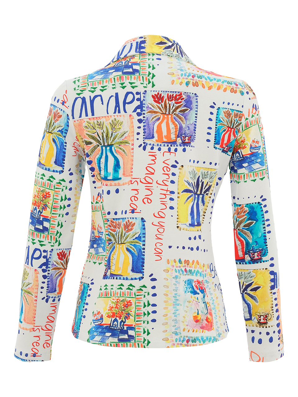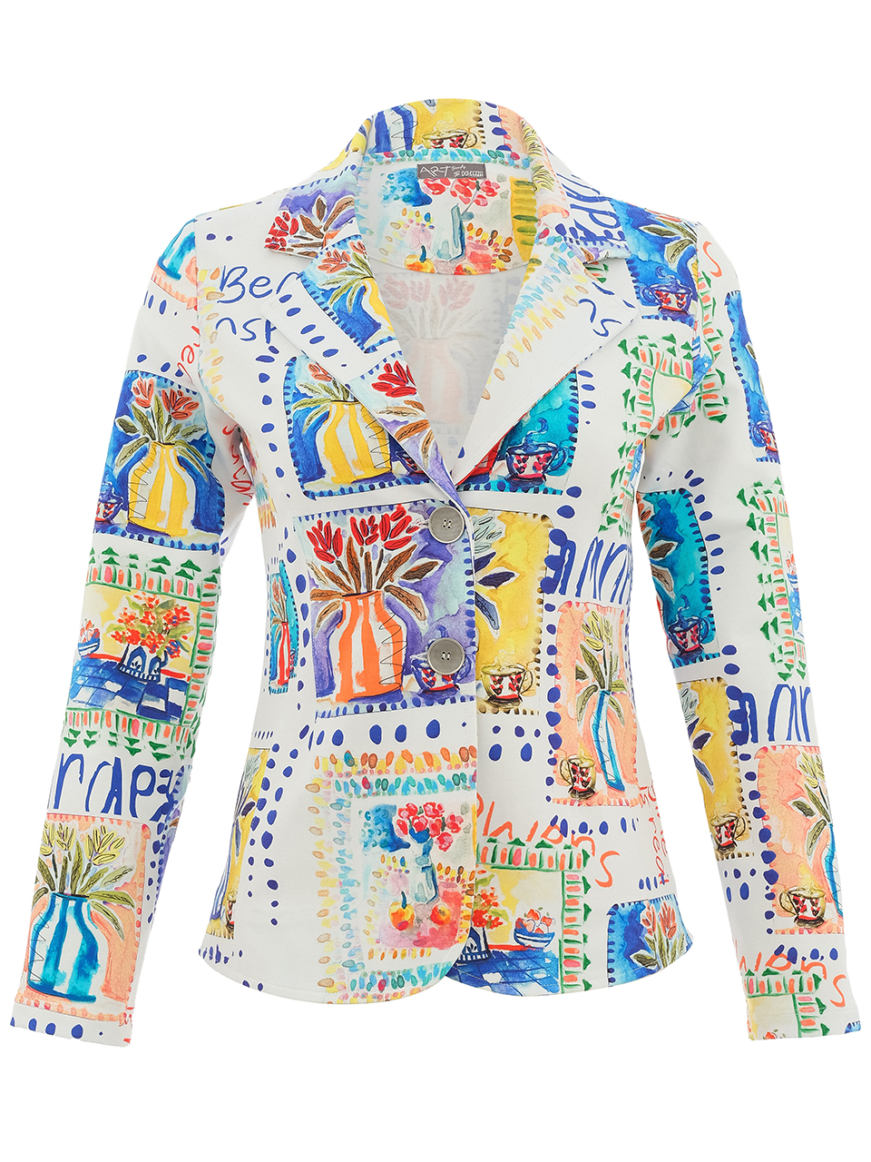 Dolcezza – 26629 – White/Multi – Jacket – ” My Handmade Garden” Artist By Basak Erarslan. – Elevate your style with Artistic flair with Dolcezza Blazer Jacket “My Handmade Garden”—a stunning blend of comfort and artistic expression. Adorned with an allover colorful print by Basak Erarslan artwork, this blazer captures the essence of summer sunshine, bringing vibrant energy to your wardrobe.