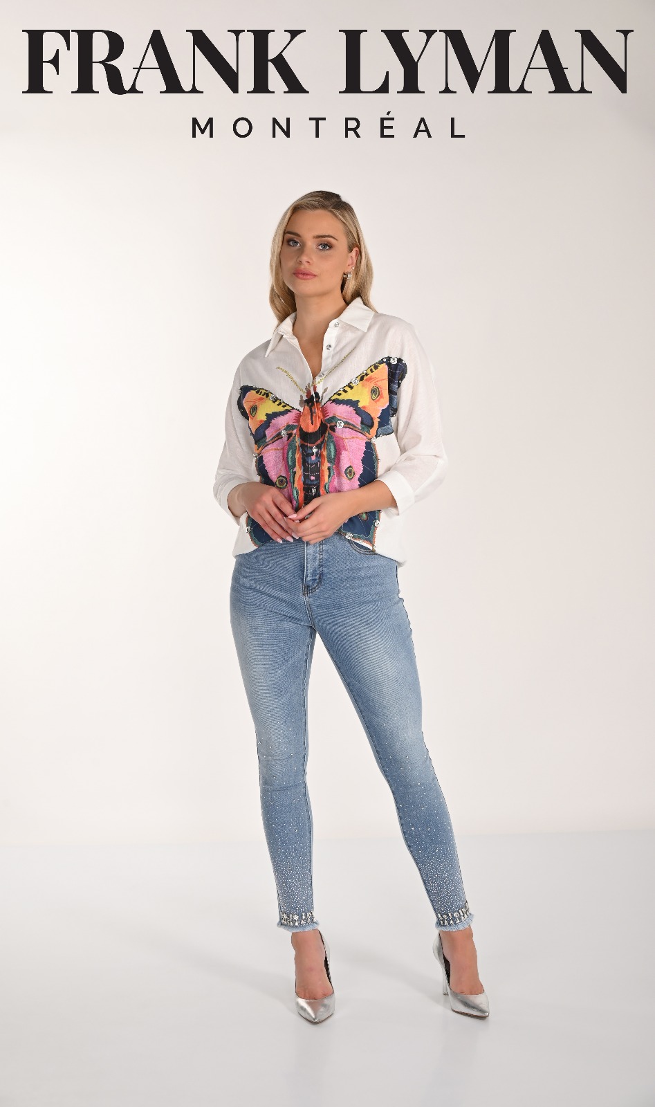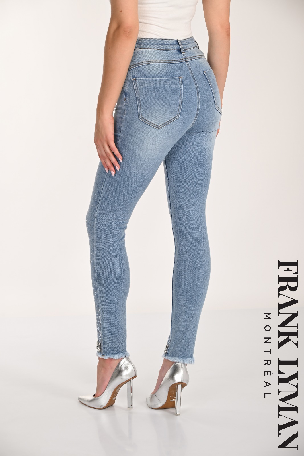 Frank Lyman – 266528 – Light Blue – Denim Jeans – These high-waisted skinny jeans are perfect for both casual outings and night out adventures. With their full-length design and edgy style, they offer a sleek silhouette. Adorned with jewels and buttons, these plain-patterned jeans add a touch of sophistication to any outfit. Experience the perfect blend of fashion and function.