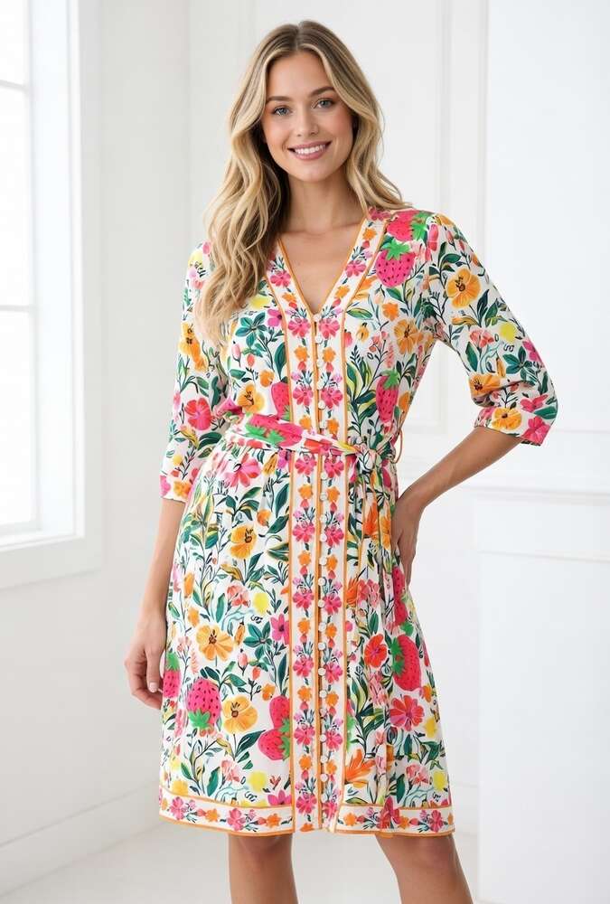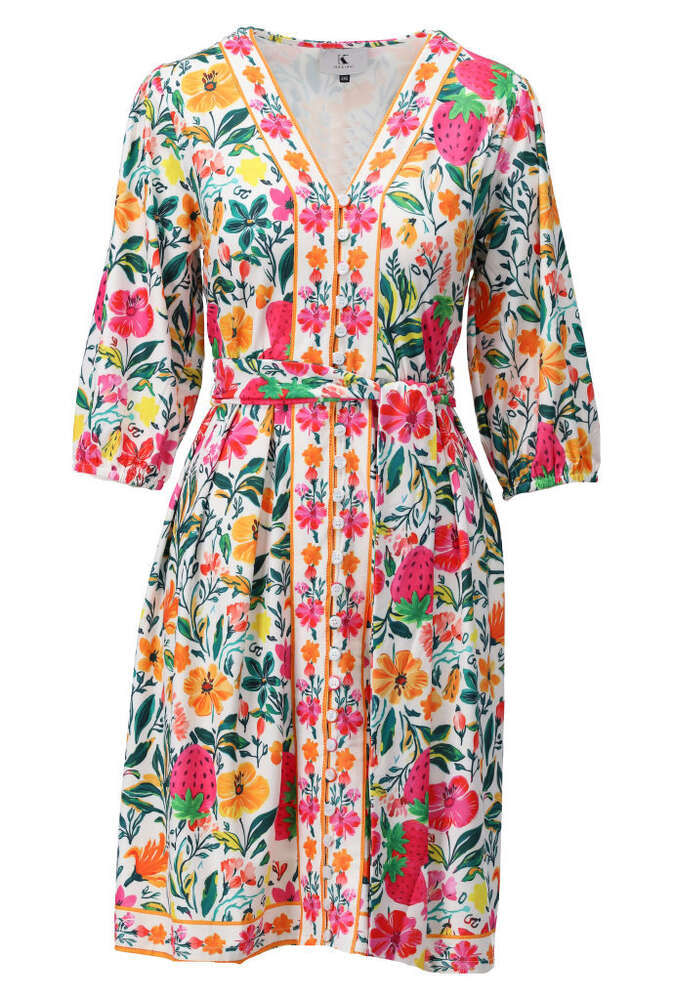 K.Design – C402-P137 – Multi – Dress – This K-design dress is a real eye-catcher with its vibrant and colourful floral print that instantly creates a summery look. The flattering silhouette accentuates your waist with the matching belt, while the three-quarter sleeves add an elegant touch. Perfect for both casual days out and a cheerful evening look.