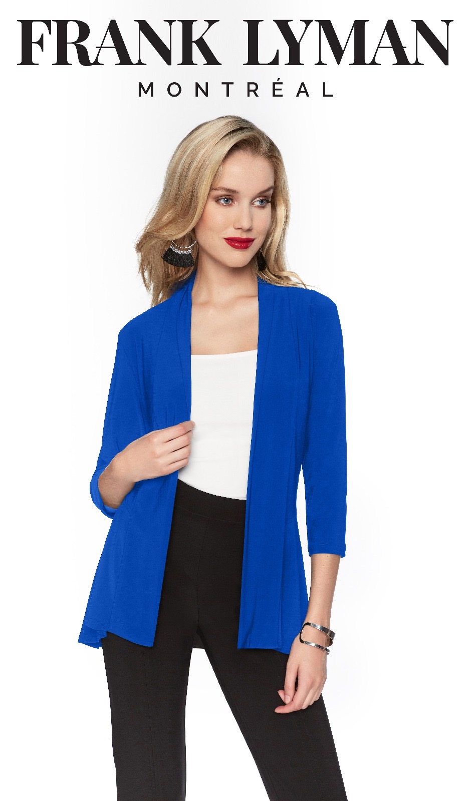 Frank Lyman – 071 – Royal Blue – Cover -This basic drape cardigan available in black is a staple for every woman’s wardrobe. This 3/4 length sleeves are a perfect coverup for any occasion and is designed with diagonal drape panelling. This is a flattering light weight cardigan which can be dressed up or down.