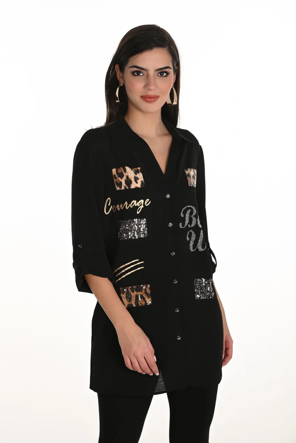Frank Lyman – 253824 – Blouse – Black – Step into style with the Frank Lyman blouse, featuring a chic button closure and regular fit for ultimate comfort. This hip-length, design combines text and animal prints for a unique touch. Perfect for casual outings, office wear, or a night out, its long, straight sleeves and embroidered jewel details add an urban flair. This versatile piece effortlessly blends fashion and function.