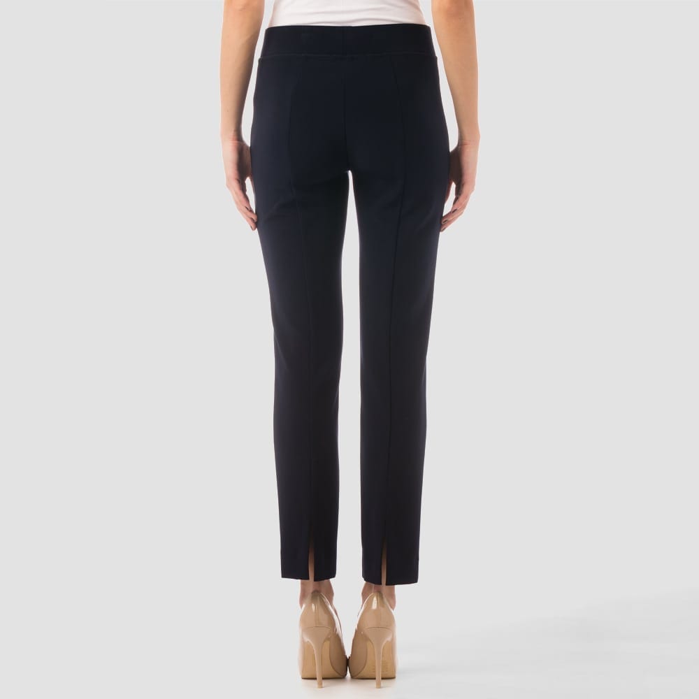 Joseph Ribkoff – 143105 – Navy – Trouser – Sleek and sassy pant in a polyester and Spandex blend fabric. High elastic waist for a stylish fit in easy to wear comfortable style. Gorgeous cut flatters waist and legs. Hem falls at the ankle with large split sits beautifully with tops, tunics, sweaters, and more.