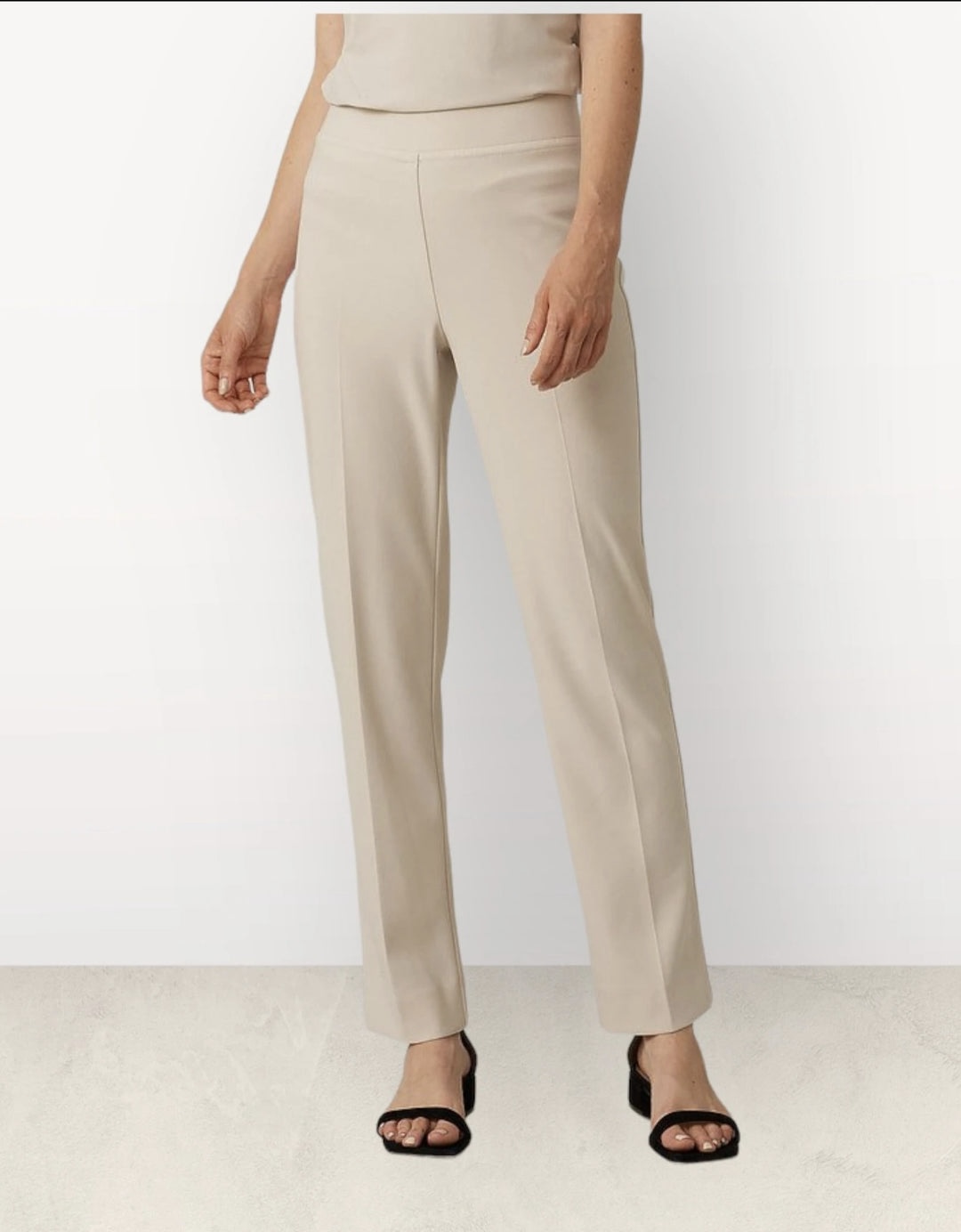 Joseph Ribkoff – 153088 – Moonstone – Trouser – Create the illusion of longer legs with a slightly higher waistline in these wide-leg pants. The 32-inch inseam creates a lengthening effect especially when paired with a tucked-in blouse and fashionable heels. The silky knit fabric and elasticized waistband offer class with unparalleled comfort.