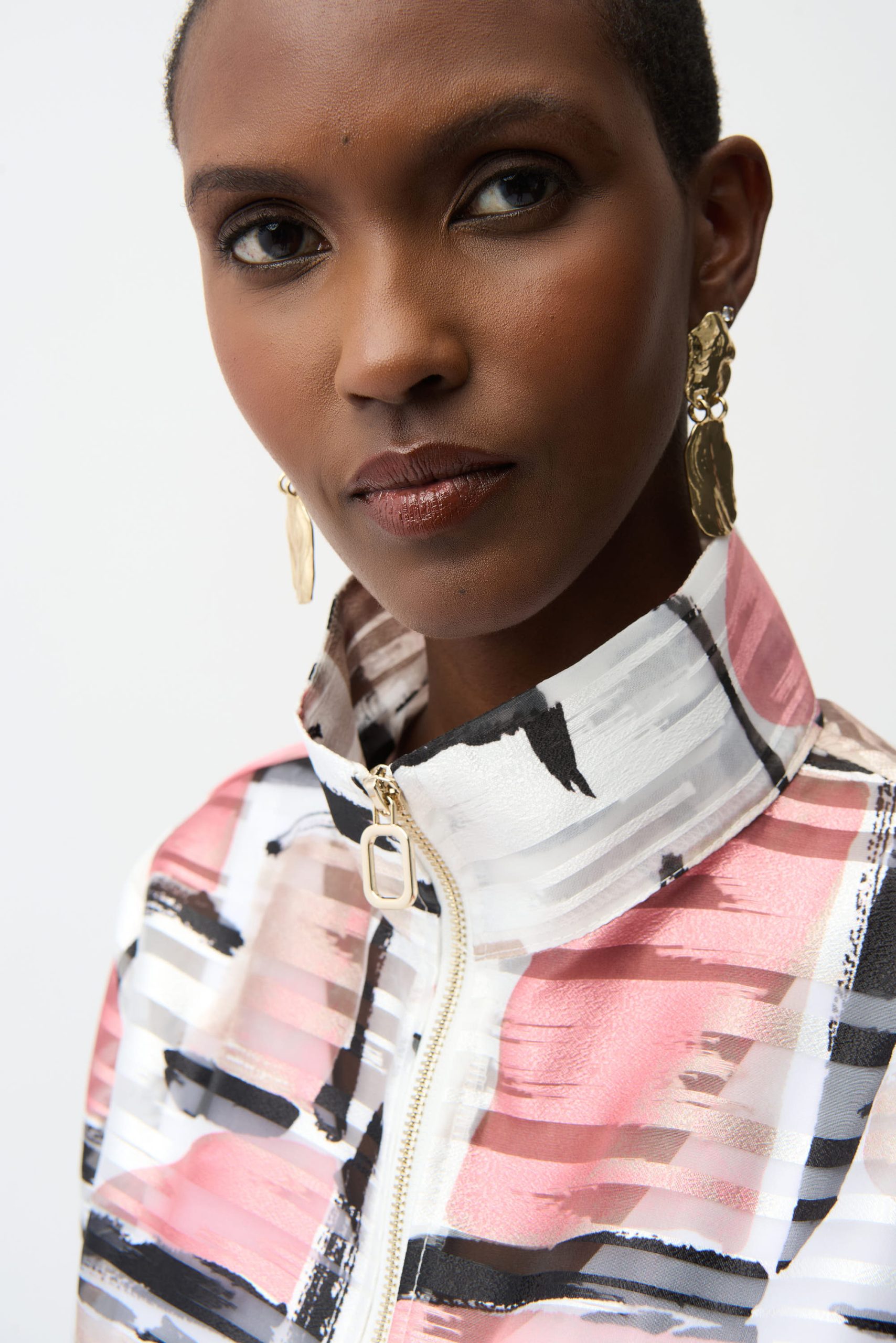 Joseph Ribkoff – 261052 – Vanilla/Multi – Jacket – Light yet structured, this abstract printed jacquard organza jacket features a modern funnel collar, front zip closure, and three-quarter cuffed sleeves.