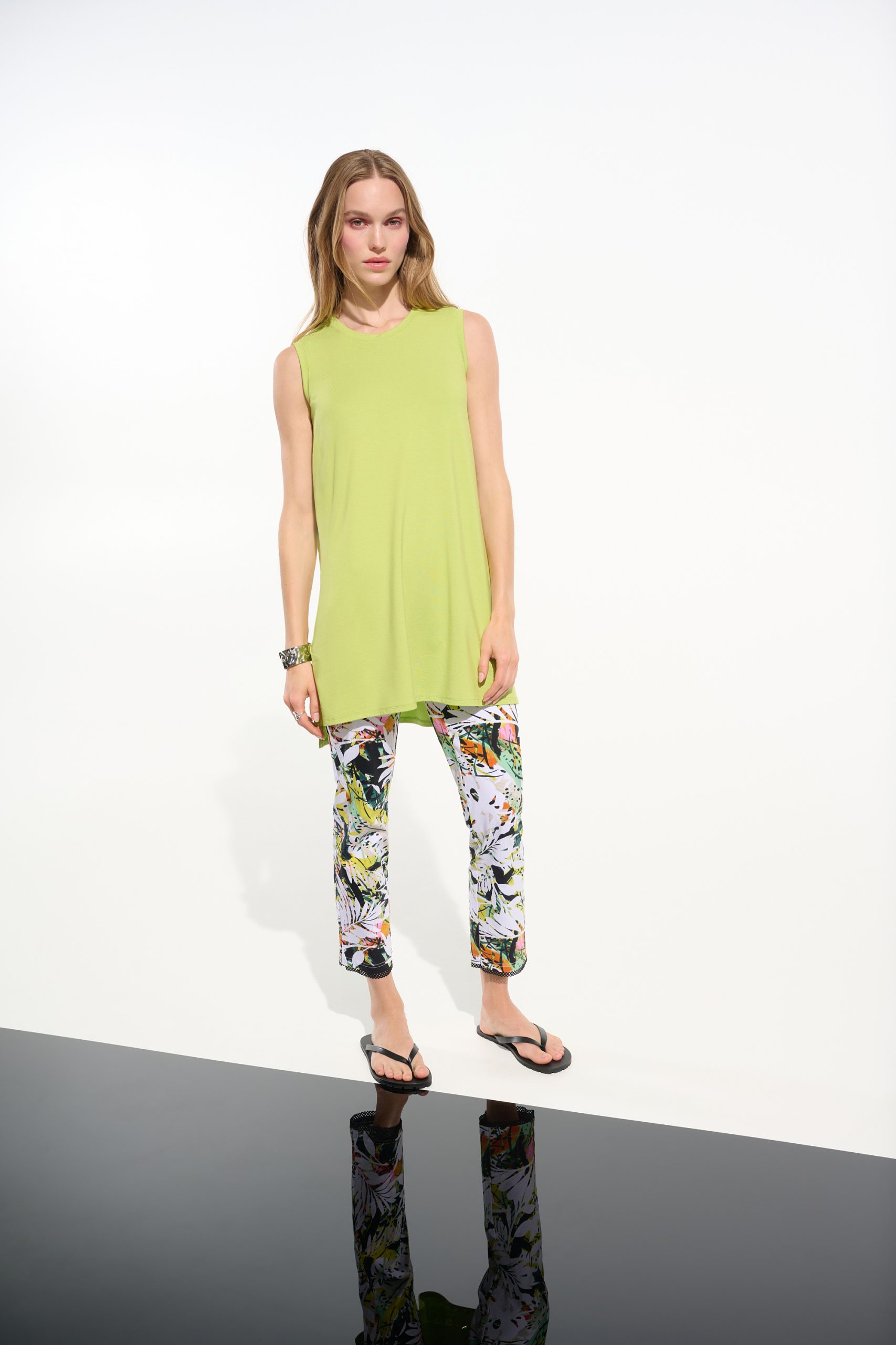 Joseph Ribkoff – 261603 – Vanilla/Multi – Pant – These cropped pull-on pants in tropical printed millennium fabric strike the balance between comfort and detail. Designed with a hidden elastic waistband, faux fly, JR ornament at the waist, and a sporty mesh hem finish.