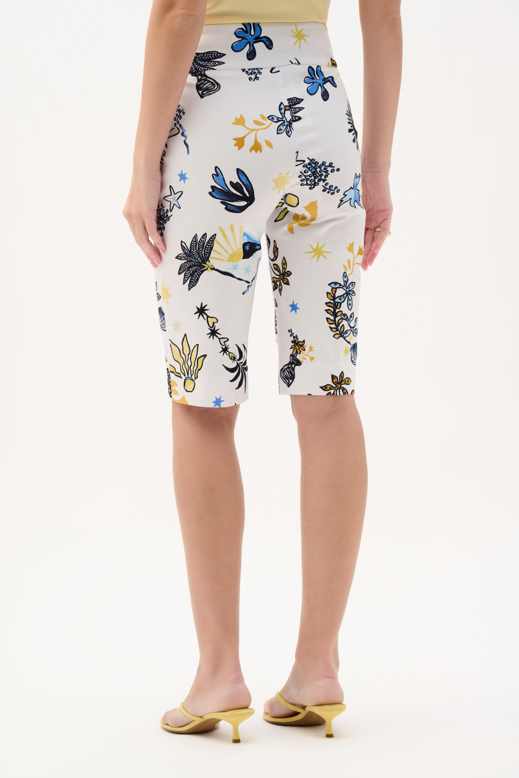 Joseph Ribkoff – 262228 – Vanilla/Multi – Bermuda Short – These printed millennium Bermuda shorts blend motifs with a sleek contour waistband. Finished with decorative pockets, a JR ornament, and side slits, they balance polish with everyday ease.