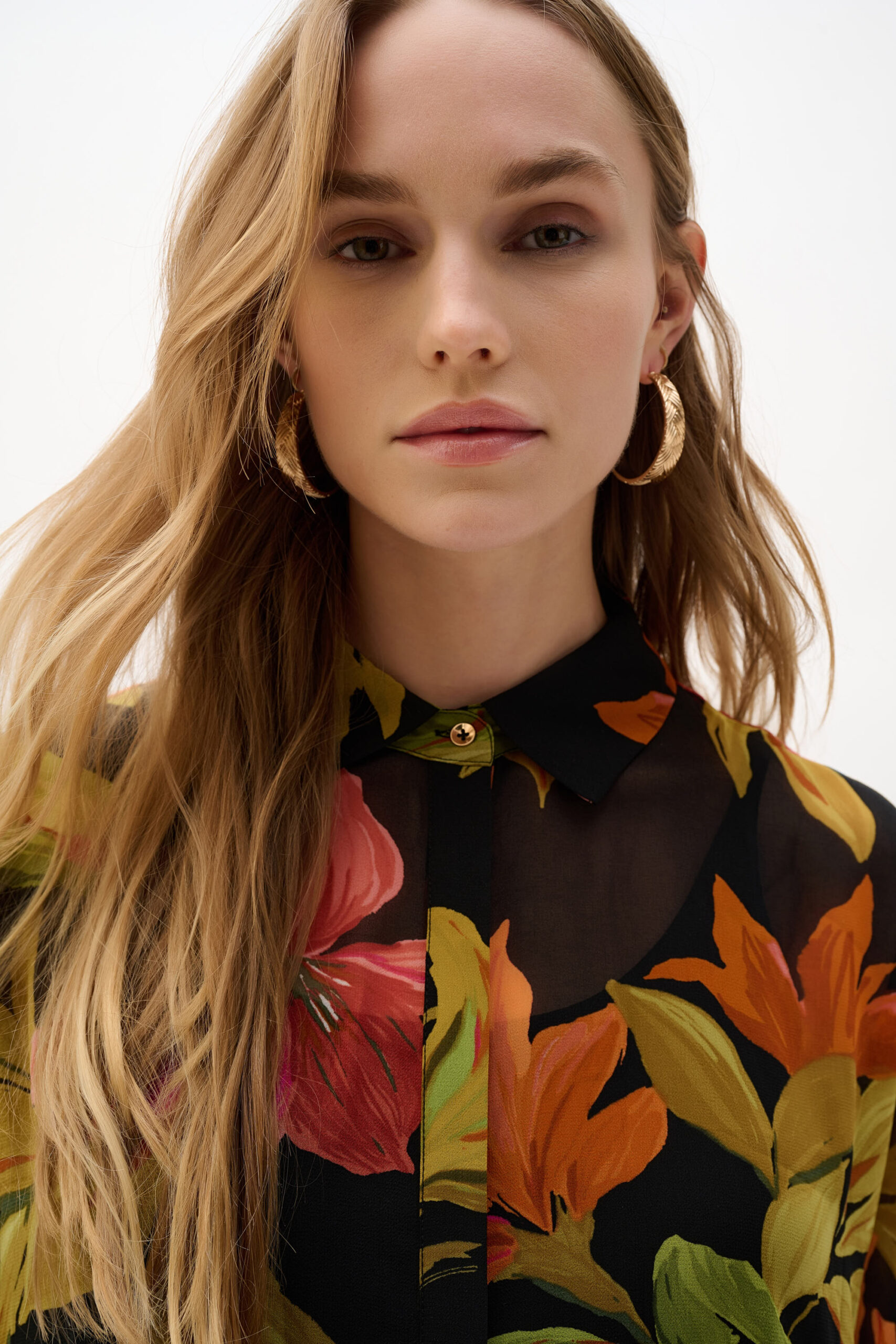 Joseph Ribkoff – 262949 – Black/Multi – Cover – Lightweight chiffon brings ease to this tropical print blouse, designed with a shirt collar and fly-front placket detailed with gold-tone buttons. Short dolmen sleeves and a shirttail hem with side openings add relaxed movement to the straight silhouette.