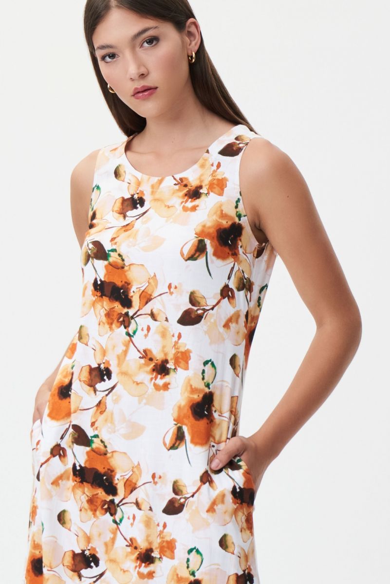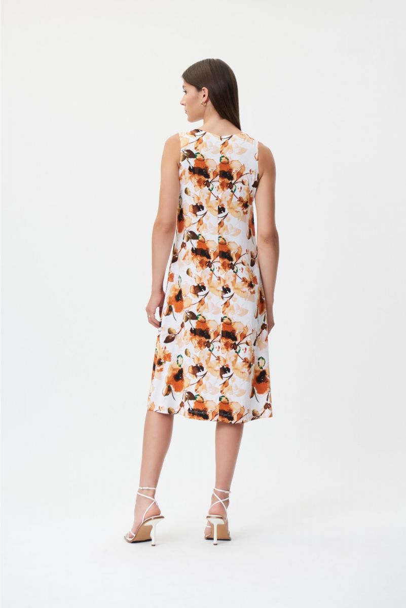 Joseph Ribkoff – 232064 – Vanilla/Multi – Dress – For a garden party or summers day, this floral-linen blend dress is a Beautiful choice. This pull on style sleeveless dress has a rounded neckline and side pockets, it is a timeless piece for your summer days.