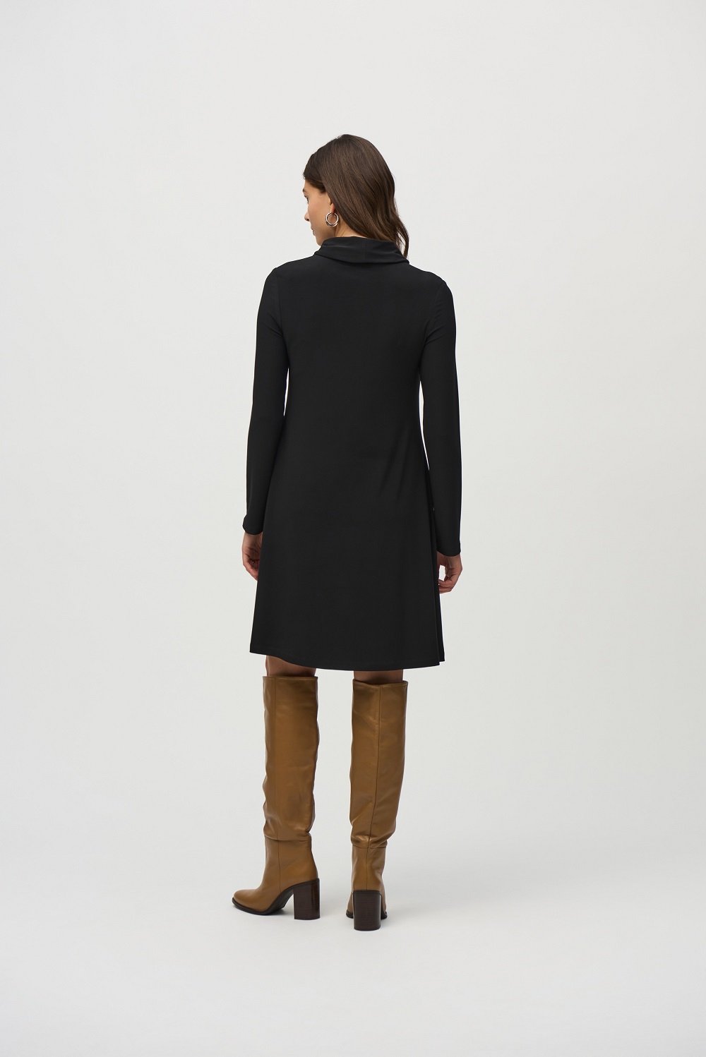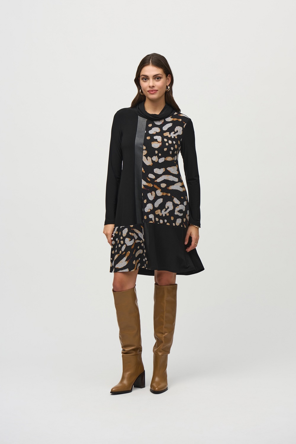 Joseph Ribkoff – 244028 – Black/Multi – Dress – Indulge in modern elegance with this exquisite silky knit dress. The alluring animal print, cowl neckline and three-quarter sleeves exude effortless sophistication. Sleek sweater knit inserts and leatherette details accentuate the garment as the A-line design envelops the silhouette to perfection.