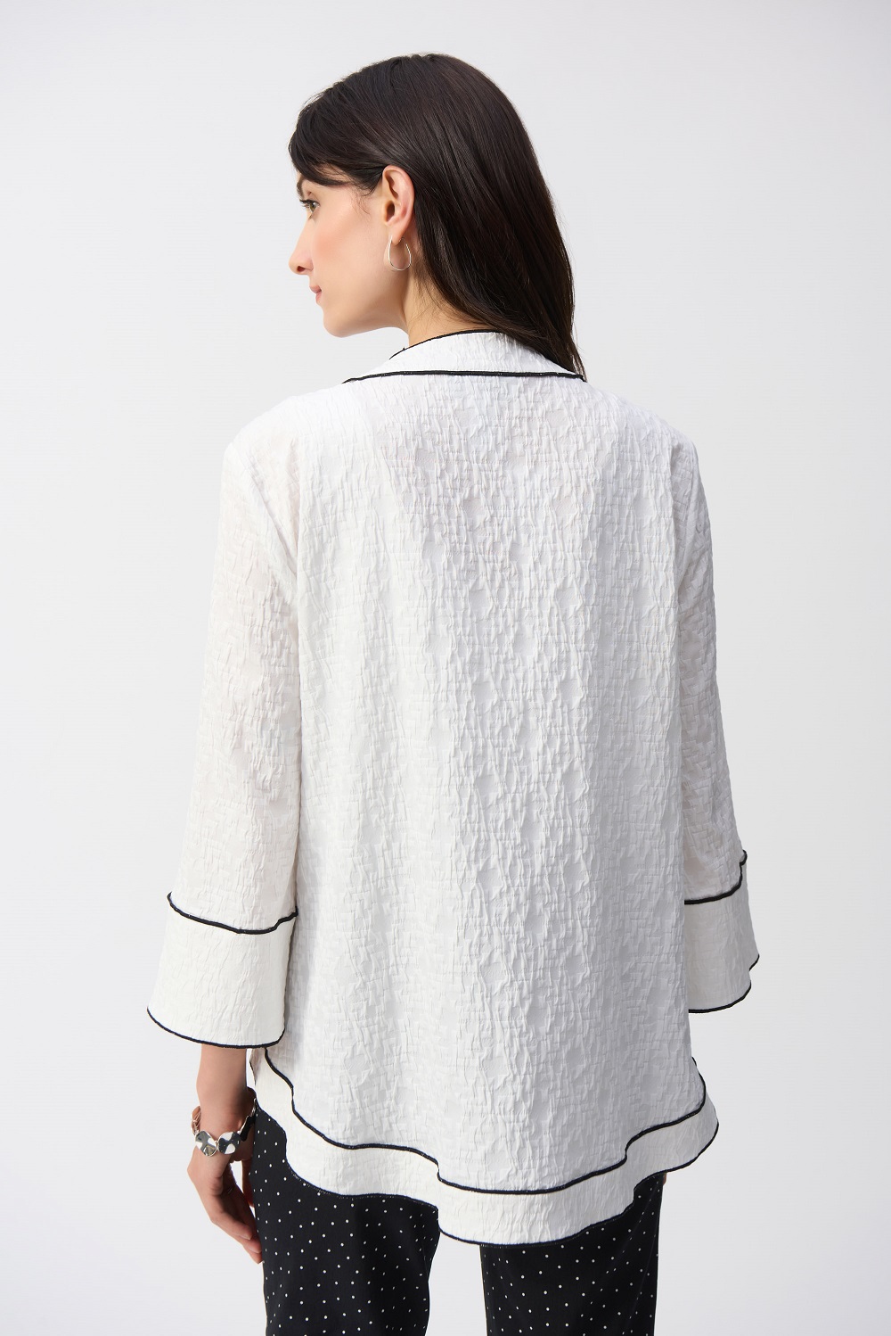 Joseph Ribkoff – 251090 – White/Black – Jacket – This jacket highlights flawless style and undeniable poise. Crafted in a jacquard fabric, the garment presents a chic swing silhouette with a charming front button closure creating a beautiful V-shaped neckline when secured. The three-quarter cuffed sleeves lend a bold look to this remarkable contemporary piece.