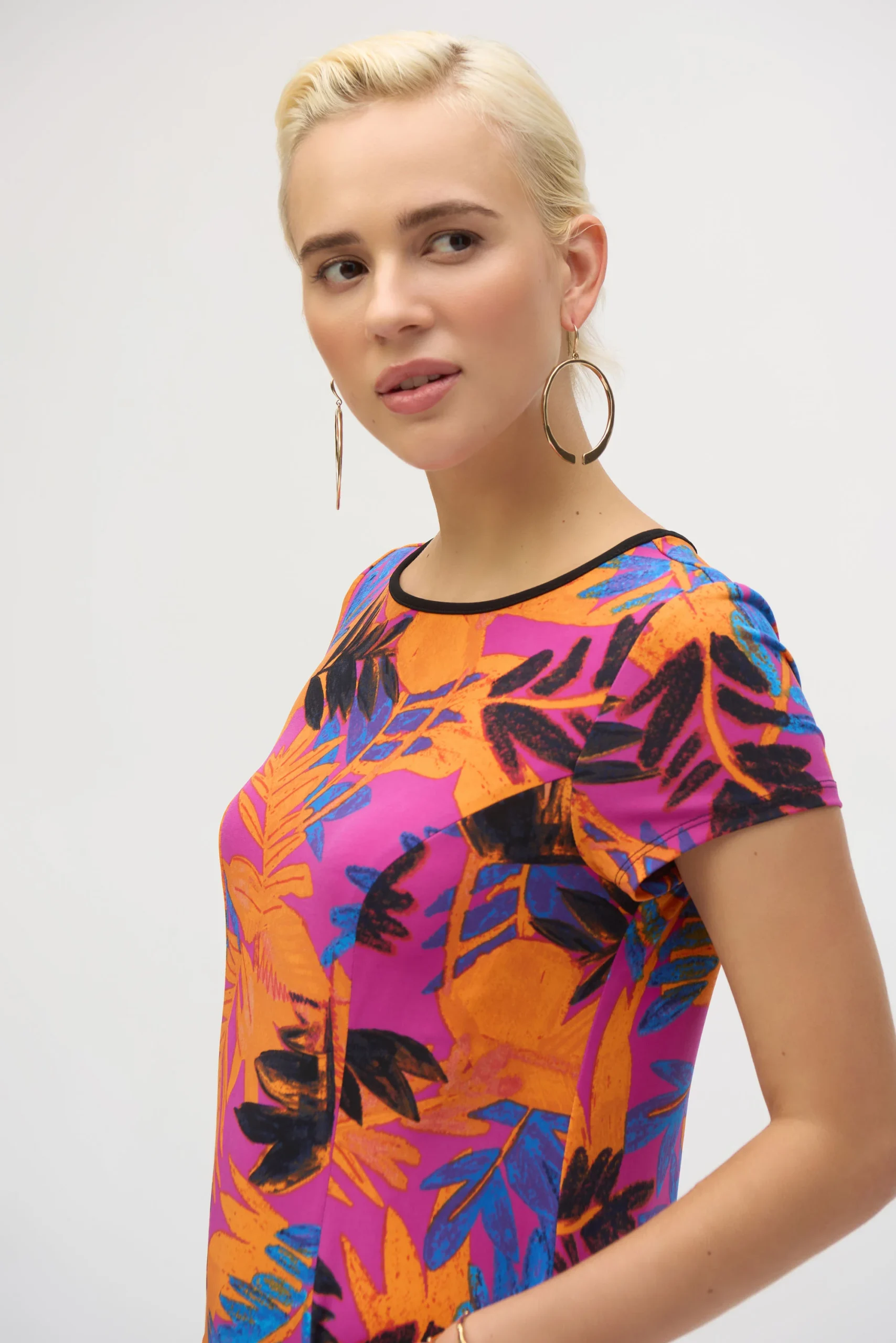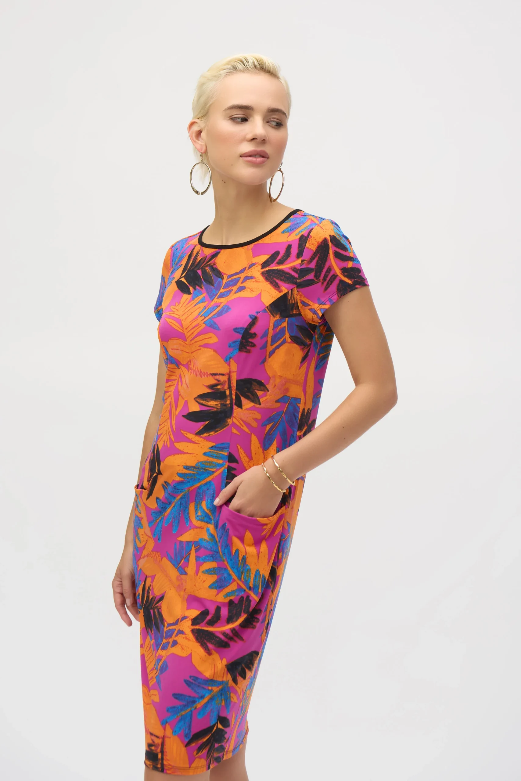Joseph Ribkoff – 252223 – Multi – Dress – Get ready to wow the crowd in this vibrant sheath dress, crafted from a luxurious silky knit adorned with a colourful tropical print. Designed with an always flattering boat neck, demure cap sleeves, and alluring over the knee length, this piece is nothing less than extraordinary.