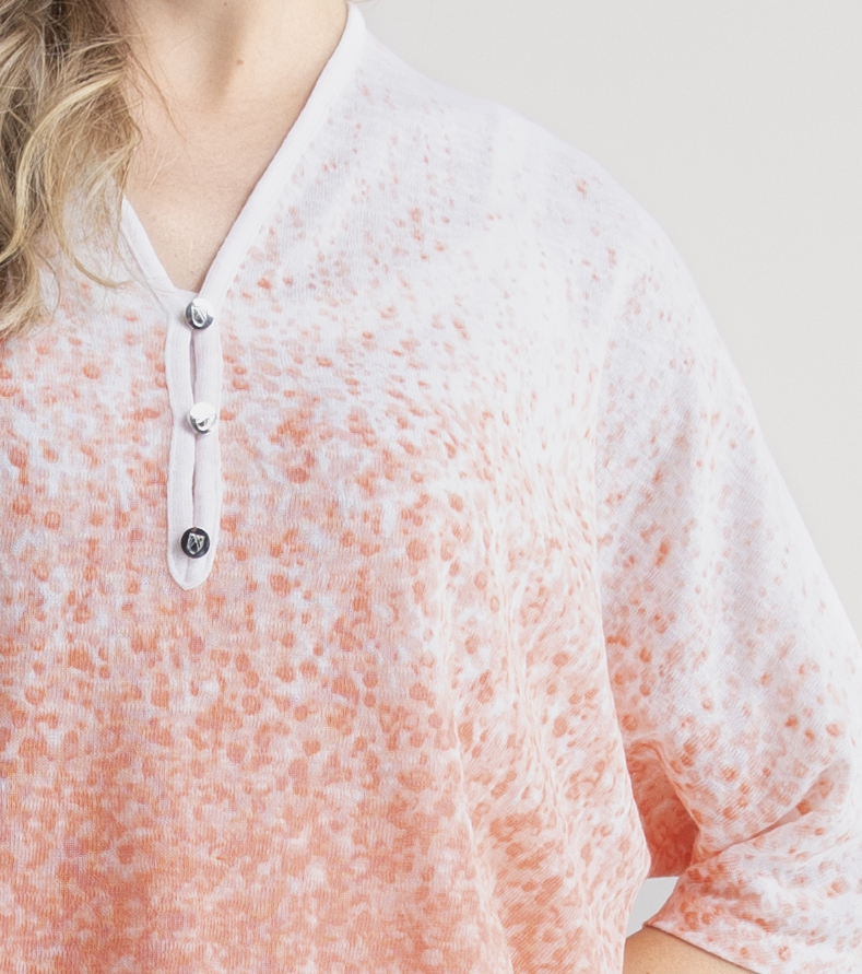 Marble – 7851-191 – Orange/White – Two piece Top – This viscose knit top is a relaxed fitting. The overtop has a graduating print with a button detail to v neckline and a matching vest