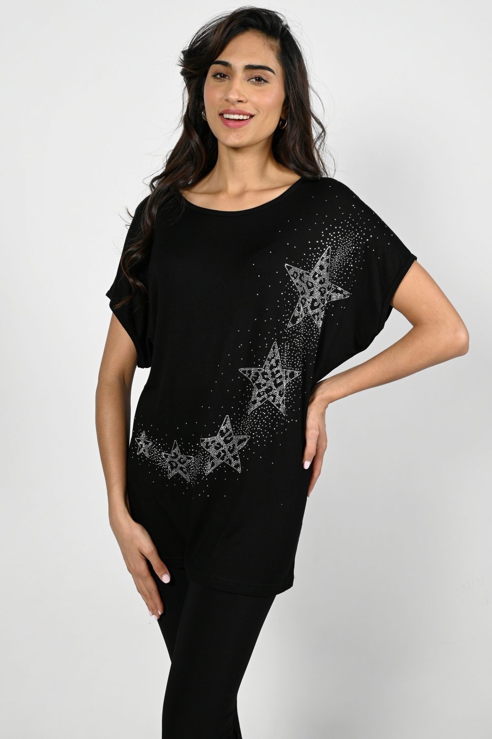 Frank Lyman – 223462U – Black – Top – You will love this star embellished print top with a round neckline and short sleeve, the print is on the front only.