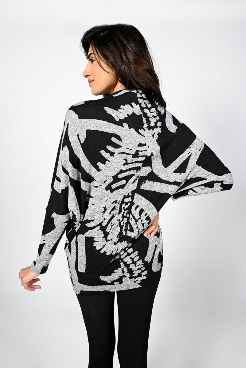 Frank Lyman – 224169 – Black/Grey – Knit Top – This very easy to wear lightweight knit top from Frank Lyman features a flattering zip V-neckline with circular zip. The top is designed with full length batwing sleeves and a curved hemline that dips at the back for a flattering fit.