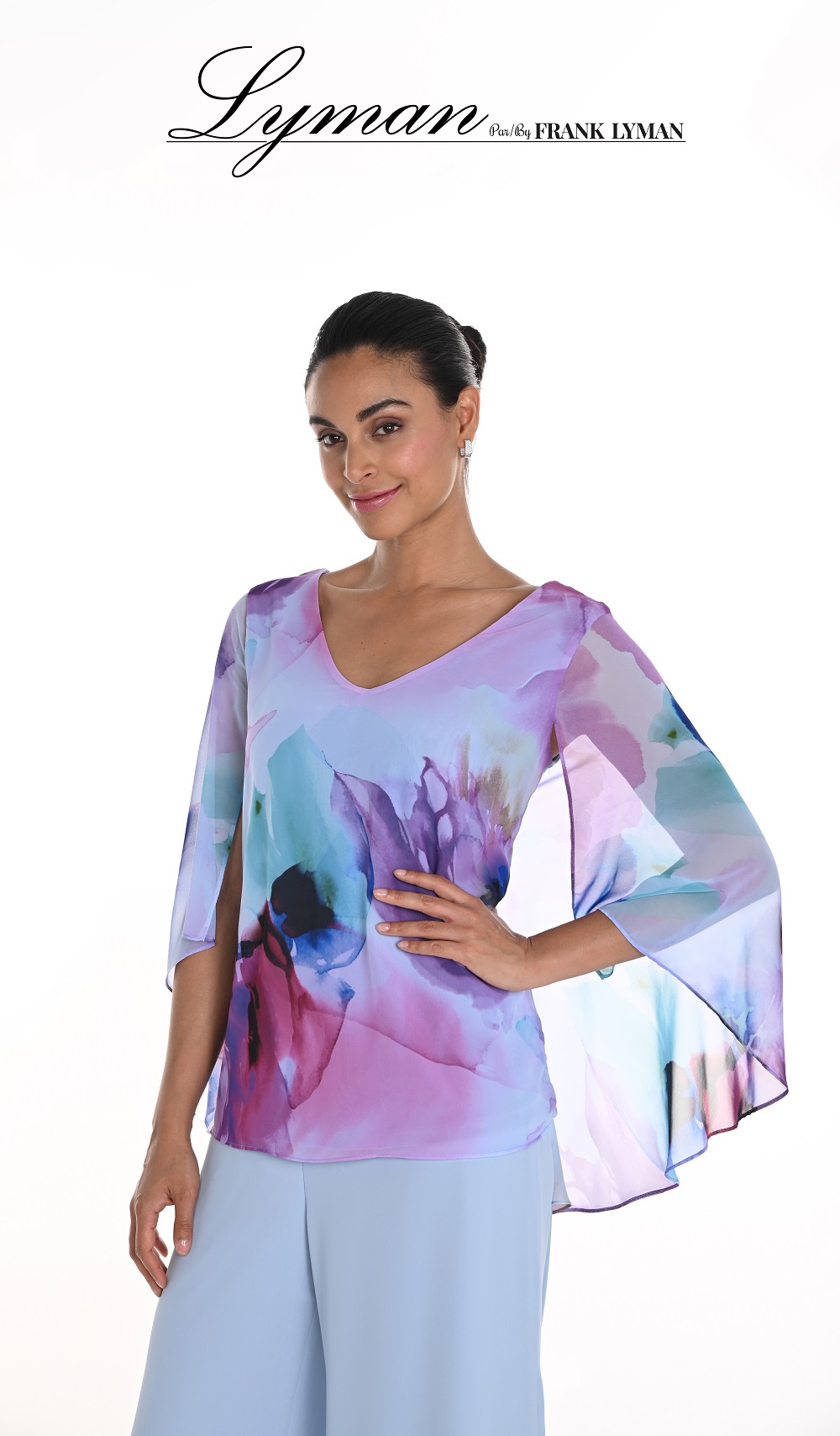 Frank Lyman – 258190 – Blue/Purple – Top – Discover effortless elegance with this Frank Lyman pullover. Featuring a relaxed fit and hip-length design, this flowy, lightweight, and sheer piece is perfect for casual summer outings or romantic dates. The V-neck and flare-sleeve add a feminine, bohemian touch, while the long sleeves and floral, abstract patterns complete the look. Ideal for the modern, style-savvy individual.