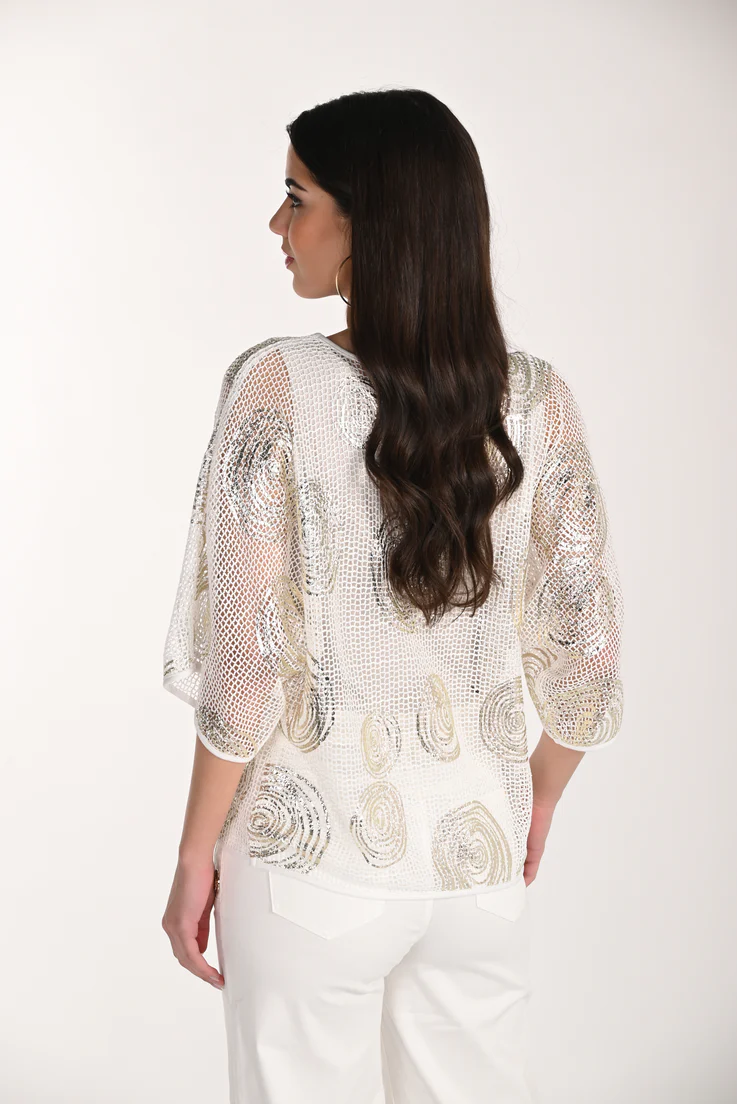Frank Lyman – 266120 – Top – Step into effortless style with the Frank Lyman top. This chic, hip-length piece boasts a loose fit and a scoop neck, perfect for casual summer outings or glamorous night outs. Adorned with glitter in an abstract pattern, the short kimono sleeves add a sheer, embellished touch. Ideal for those seeking a blend of comfort and glamour.