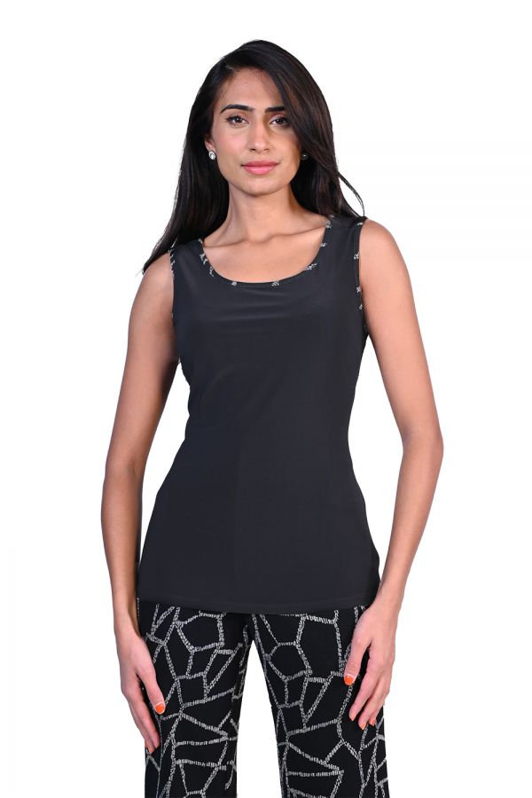 Frank Lyman – 223389/223507 – Black/Multi – Twin Set – Fabulous twin set, consisting of a sleeveless camisole without the necklace shown. The lovely jacket is very versatile and can be worn as a set or with other tops underneath. A perfect addition for the cooler weather.