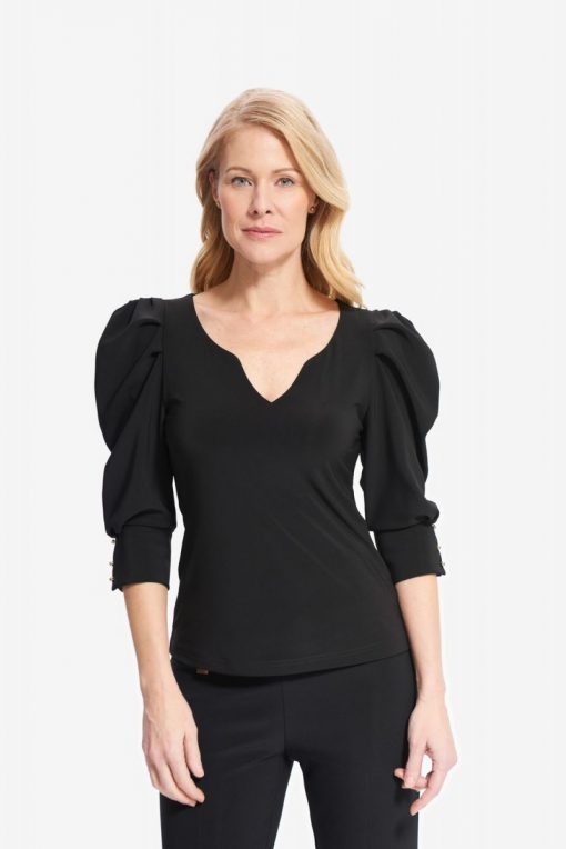 Joseph Ribkoff – 214199 – Black – Top – This gorgeous Joseph Ribkoff design features statement shoulders, giving you a sharp and confident look. You’ll love its plunging V-neckline, too, a truly feminine touch.