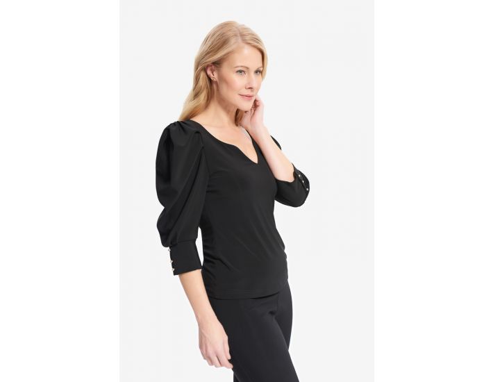 Joseph Ribkoff – 214199 – Black – Top – This gorgeous Joseph Ribkoff design features statement shoulders, giving you a sharp and confident look. You’ll love its plunging V-neckline, too, a truly feminine touch.