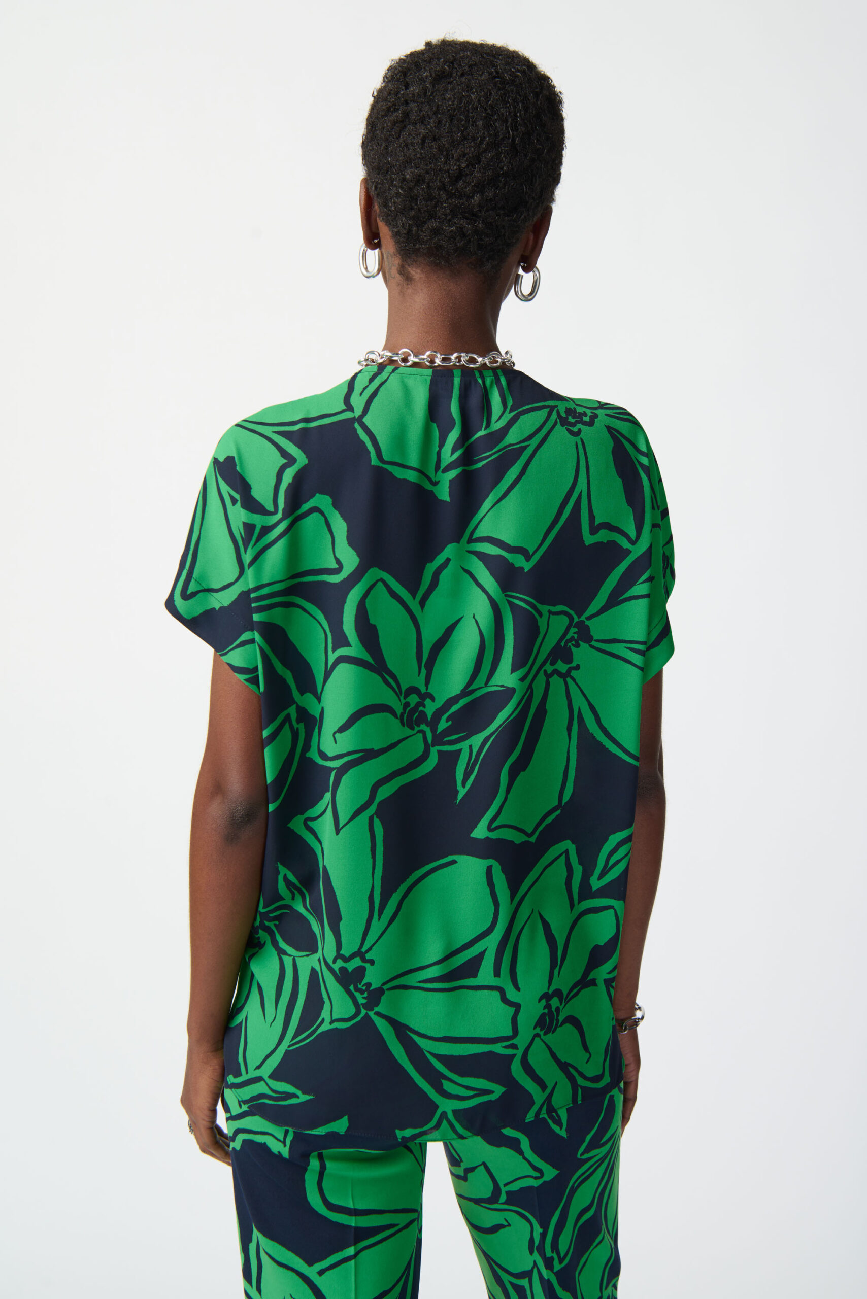 Joseph Ribkoff – 241059 – Top –  Navy/Green – New – The short dolman sleeves and slit neckline add character to this lovely floral print top. Delicately designed in georgette fabric, this garment features a beautiful high-low hemline to lend an airy feel to its bold, boxy silhouette.