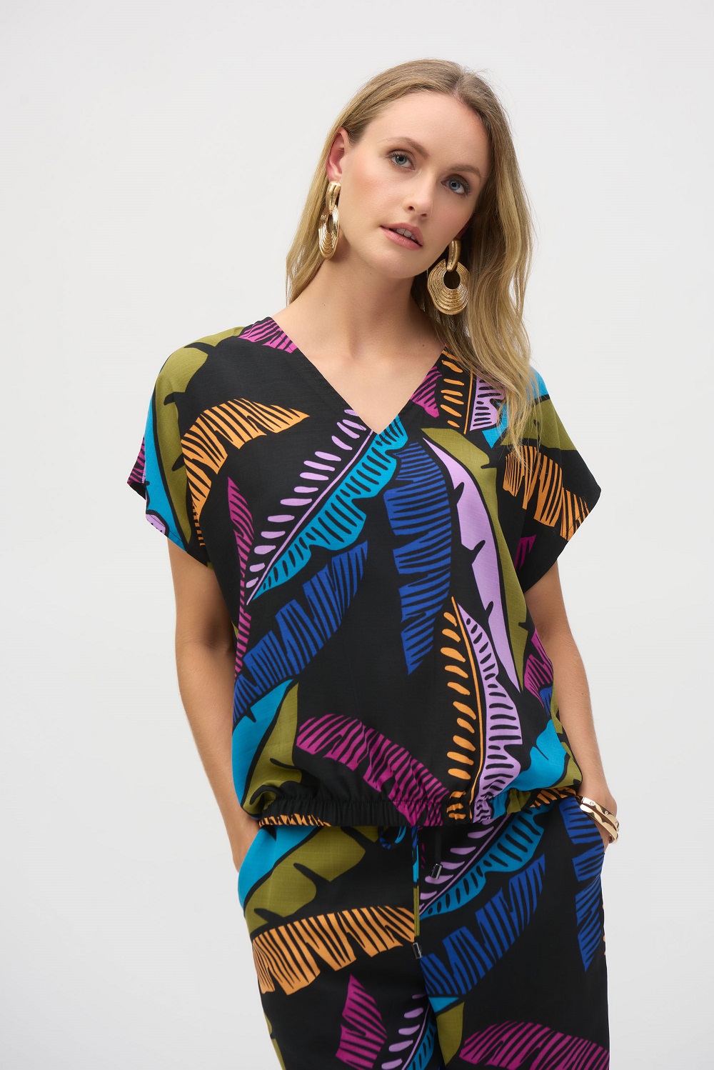 Joseph Ribkoff – 252148 – Black/Multi – Top – This breezy boxy top effortlessly combines style and comfort with its airy gauze fabric and vibrant tropical print. A flattering V-shaped neckline flows into a shirred elastic hem at the front, while short dolmen sleeves add casual charm.