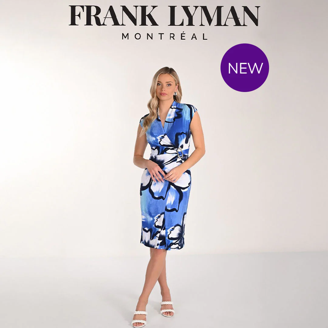 Frank Lyman – 266350 – Midnight Blue – Dress – This very sophisticated timeless dress is a statement piece that perfectly balances bold design with feminine elegance. Crafted from a silky knit stretch fabric, this dress features a striking painterly abstract floral print in shades of blue, midnight blue, and white. The mock-wrap silhouette with a gathered side and decorative ring detail creates a flattering fit that accentuates the waist.