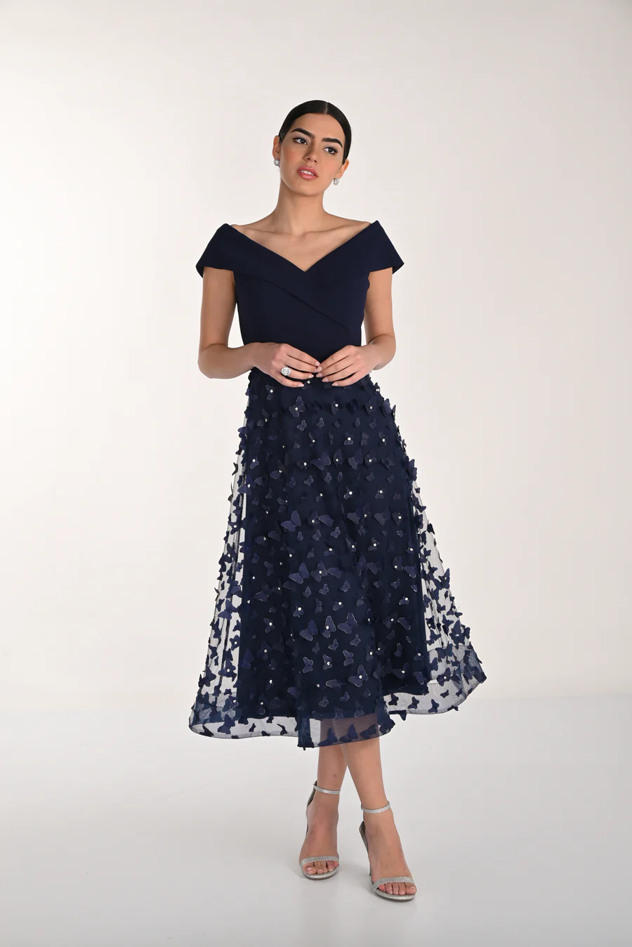 3D Butterfly Embellishments: The skirt is adorned with delicate 3D butterfly appliqués scattered across a sheer overlay, each finished with a tiny shimmering centre for a touch of sparkle.