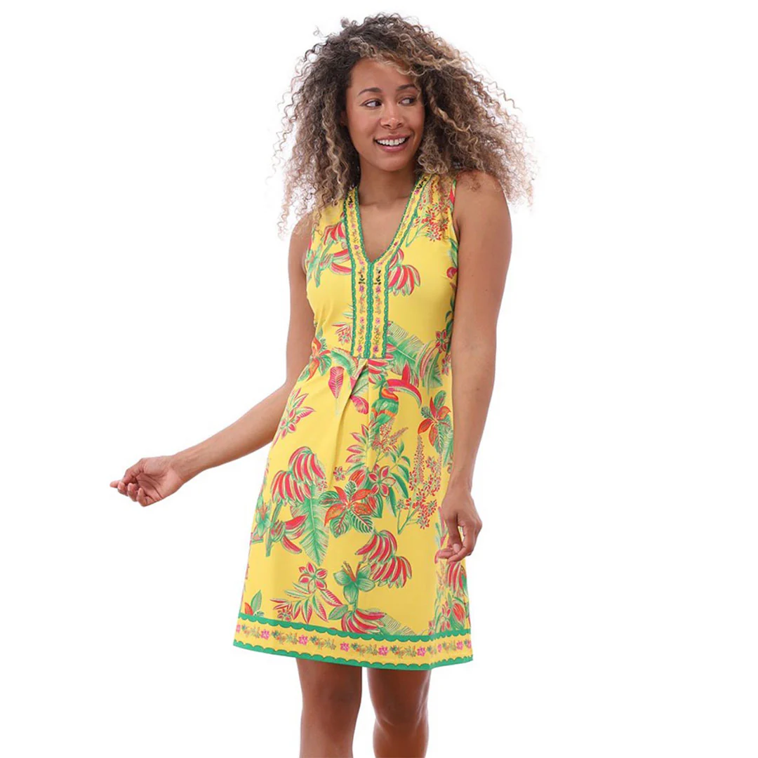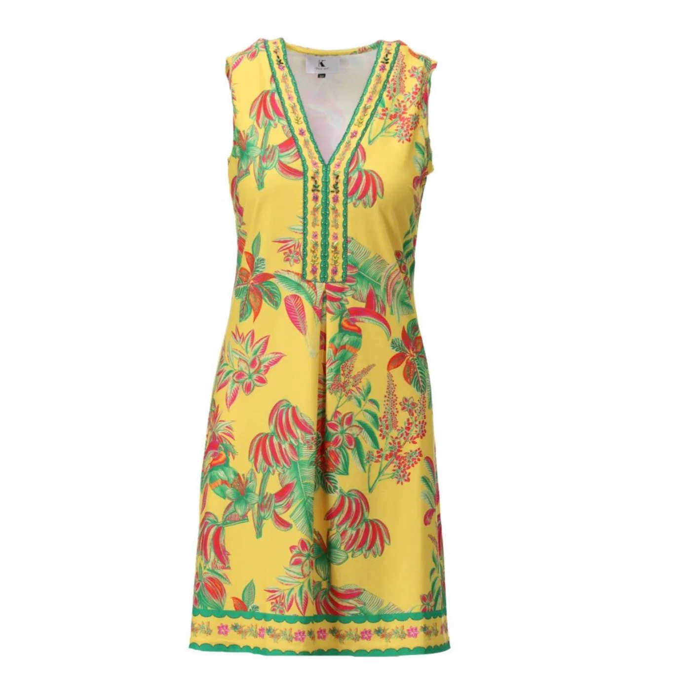 K.Design – C400 – P138 – Dress – New – This tropical print midi dress from K Design is a true feel-good summer piece — bold, flattering and effortless to wear. The vibrant yellow base is brought to life with colourful tropical florals, giving it that sunshine-ready energy while still feeling polished. Designed with a flattering sleeveless shape and soft V neckline, it skims the body beautifully and creates an easy silhouette you can simply throw on and go. The stretch fabric keeps it comfortable all day, whether you’re heading on holiday, out for lunch or dressing up for summer plans. It’s the kind of dress that lifts your mood the moment you put it on.