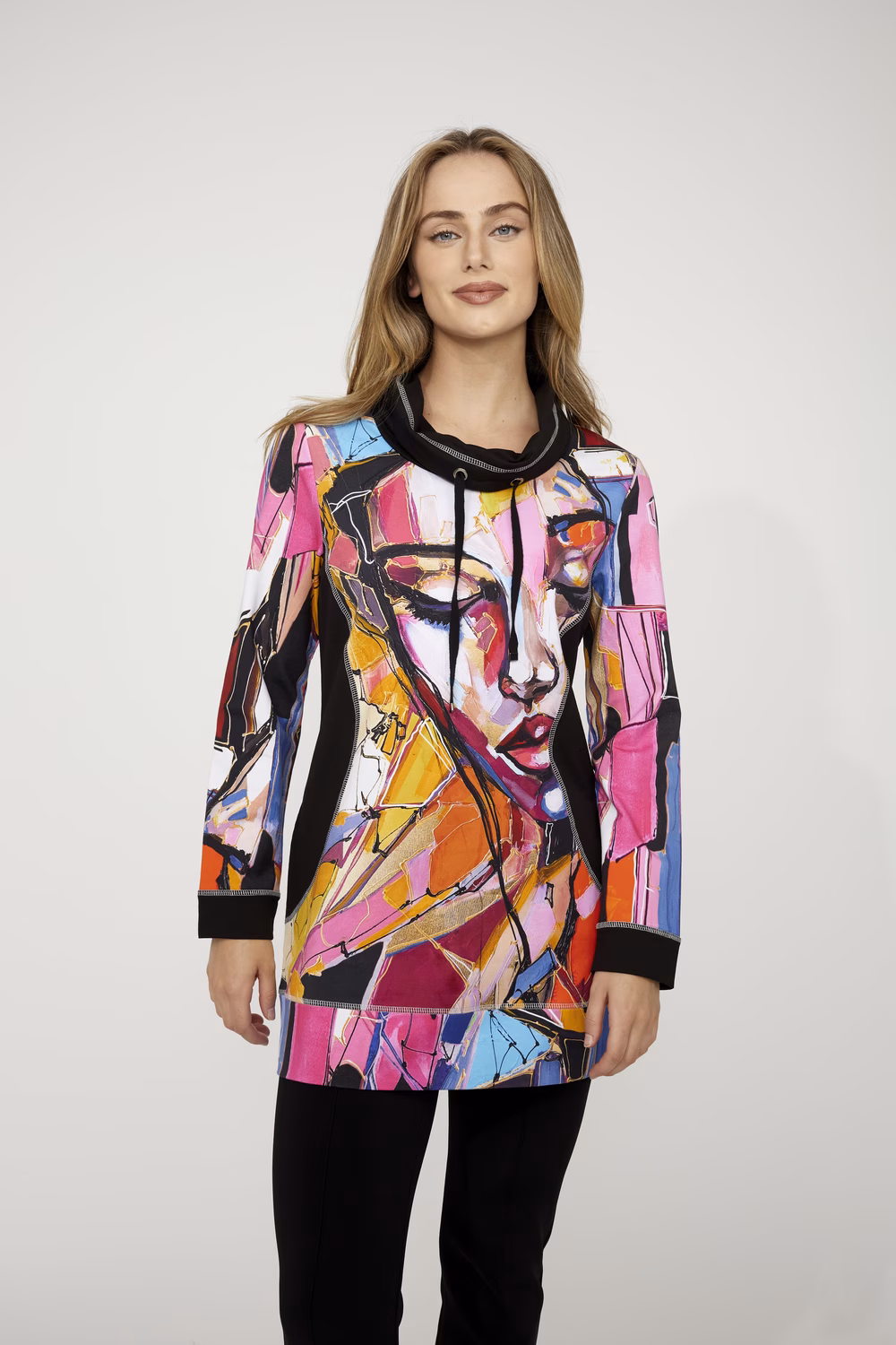 Dolcezza – 75624 – Multi -Tunic Top – Artist Lana Frey, Print “Baisti” – Experience the perfect blend of comfort and style with this tunic from Dolcezza. Featuring a cowl neck and long, straight sleeves, this regular-fit, hip-length piece is ideal for casual and semi-formal occasions. The artsy, chic design boasts an abstract, color-block pattern that adds a vibrant touch to your wardrobe. Elevate your fashion game with this uniquely crafted tunic.