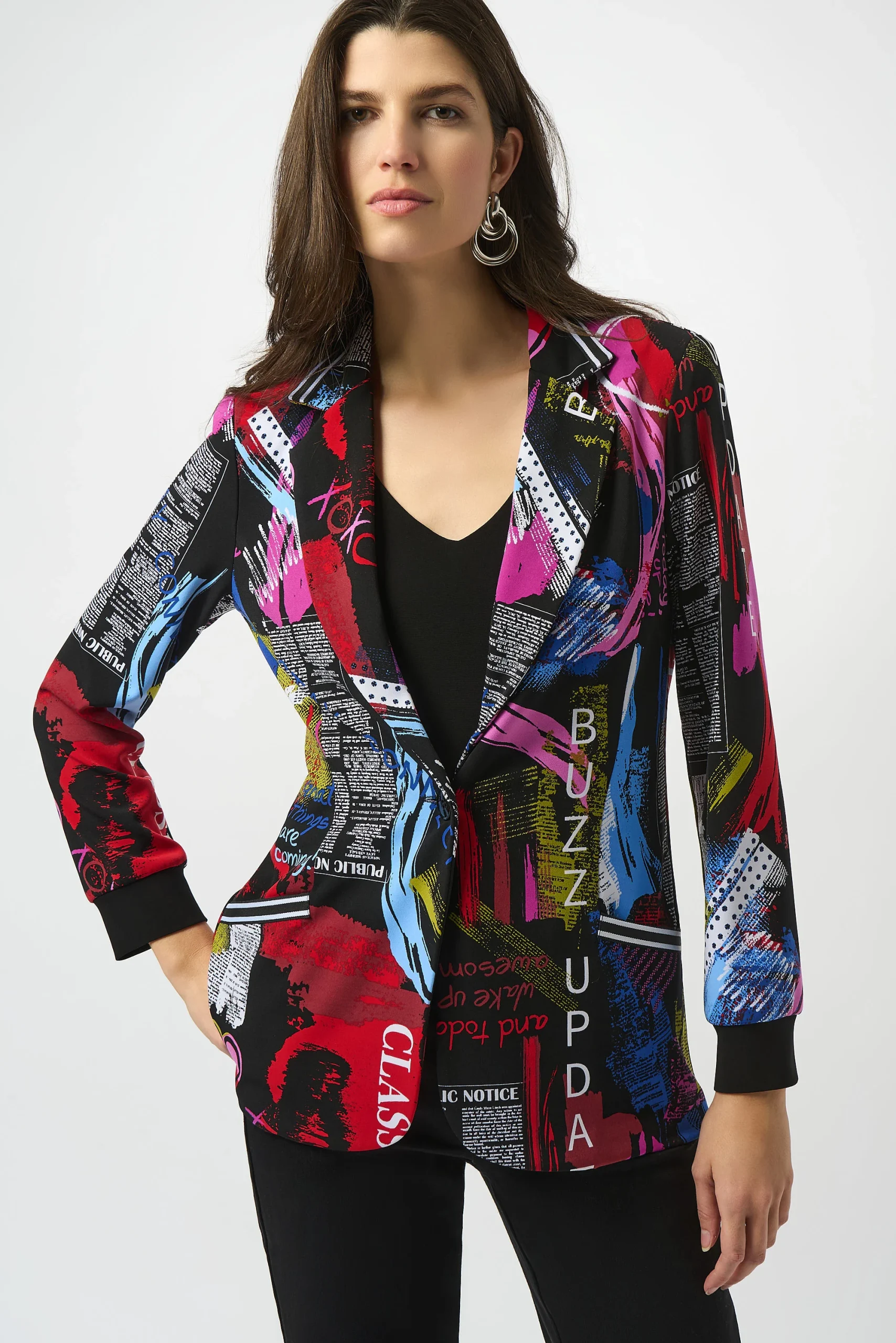Joseph Ribkoff – 253909 – Multi – Blazer – This striking silky knit blazer makes a bold statement with its distinctive word print. The notched collar, accented with a refined stripe trim detail, brings a contemporary touch to the classic straight silhouette. Chic long cuffed sleeves and pockets complete the design, practicality and sophistication to this look.