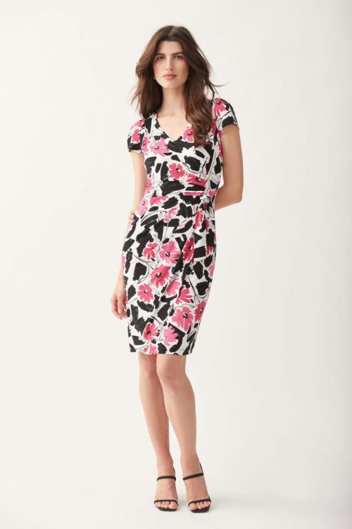 Joseph Ribkoff – 221231 – Dress – White/Multi – A fabulous dress that looks as gorgeous as it feels. Designed by Joseph Ribkoff, this lovely look features a lively floral print covering its silky texture. Designed with short sleeves and a v neckline, leading down to gathering on one side, waist tie and closed wrap style, this creates a very flattering effect.