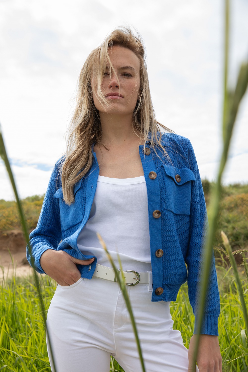 - Button fastening, pockets, long sleeves, collar.