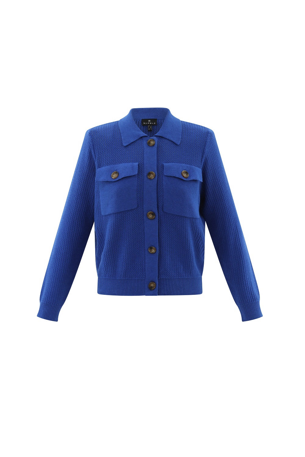 Marble – 7352-153 – Blue – Cardigan -This Marble Fashions stylish pointelle knit super soft cardigan/jacket style with a flat collar and breast pockets is ideal for everyday wear !